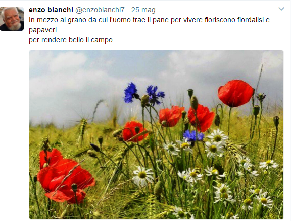 27 Maggio 20171 gennaio 2018 patriziamazzola In mezzo al grano… Anche Enzo Bianchi oggi è ispirato dal campo….. Condividi: Condividi su X (Si apre in una nuova finestra) X Condividi su Facebook (Si apre in una nuova finestra) Facebook Mi piace Caricamento... Correlati