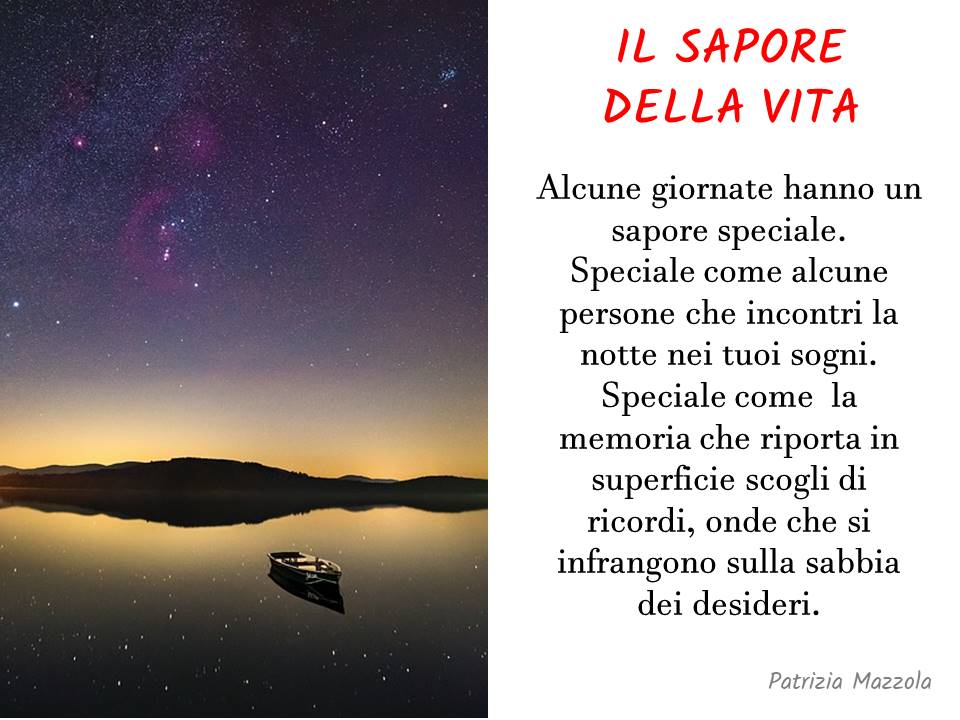 Alcune giornate hanno un sapore speciale. Speciale come alcune persone che incontri la notte nei tuoi sogni. Speciale come la memoria che riporta in superficie scogli di ricordi, onde che si infrangono sulla sabbia dei desideri.
