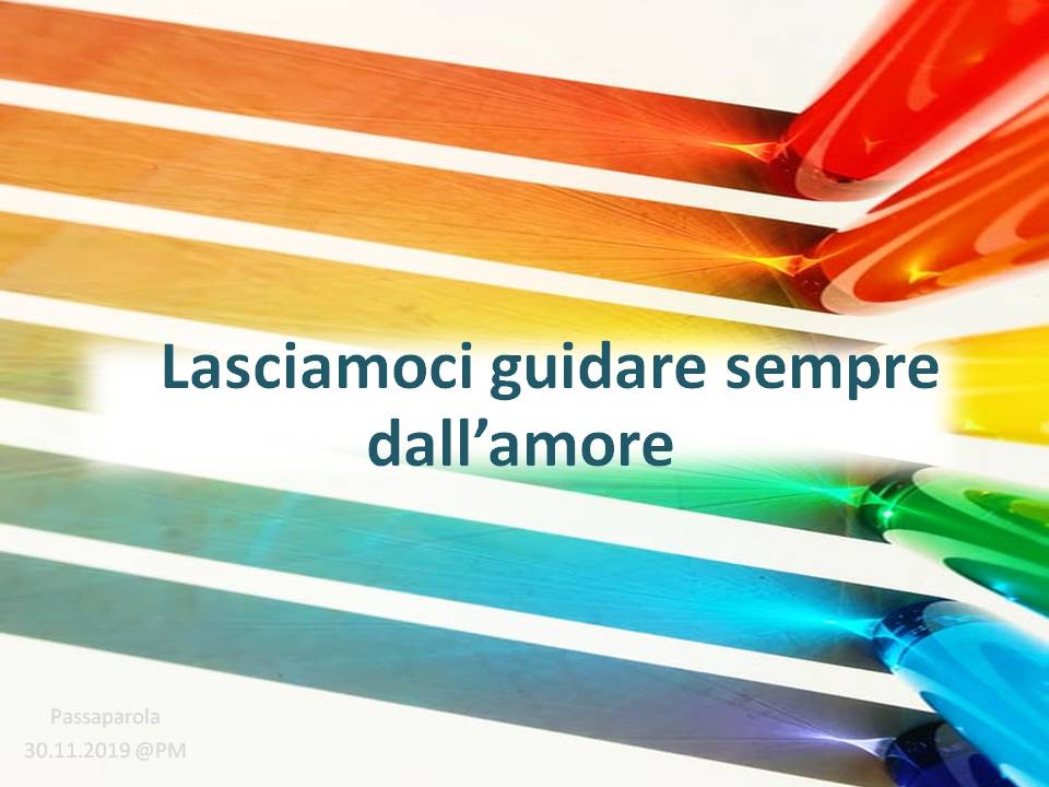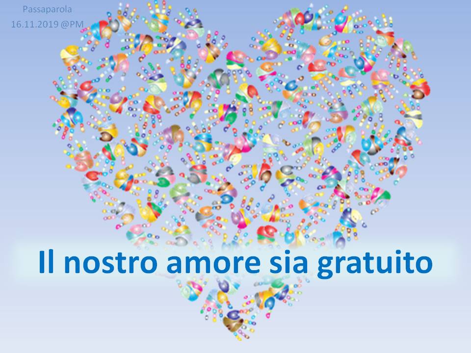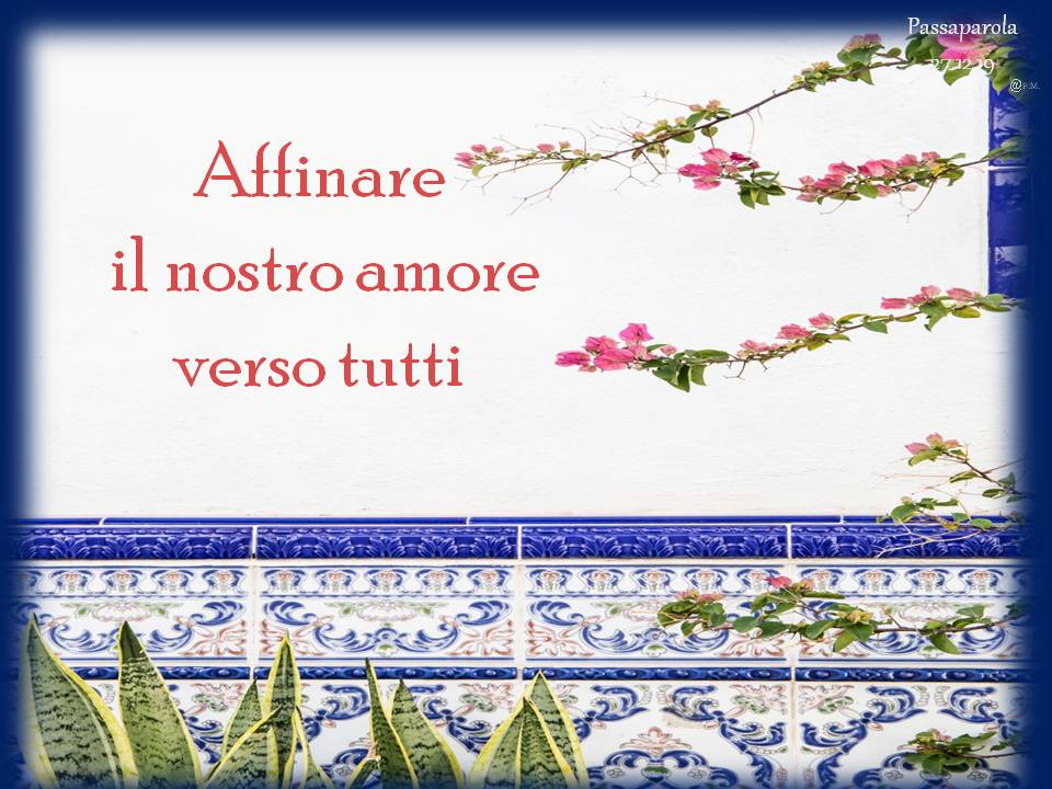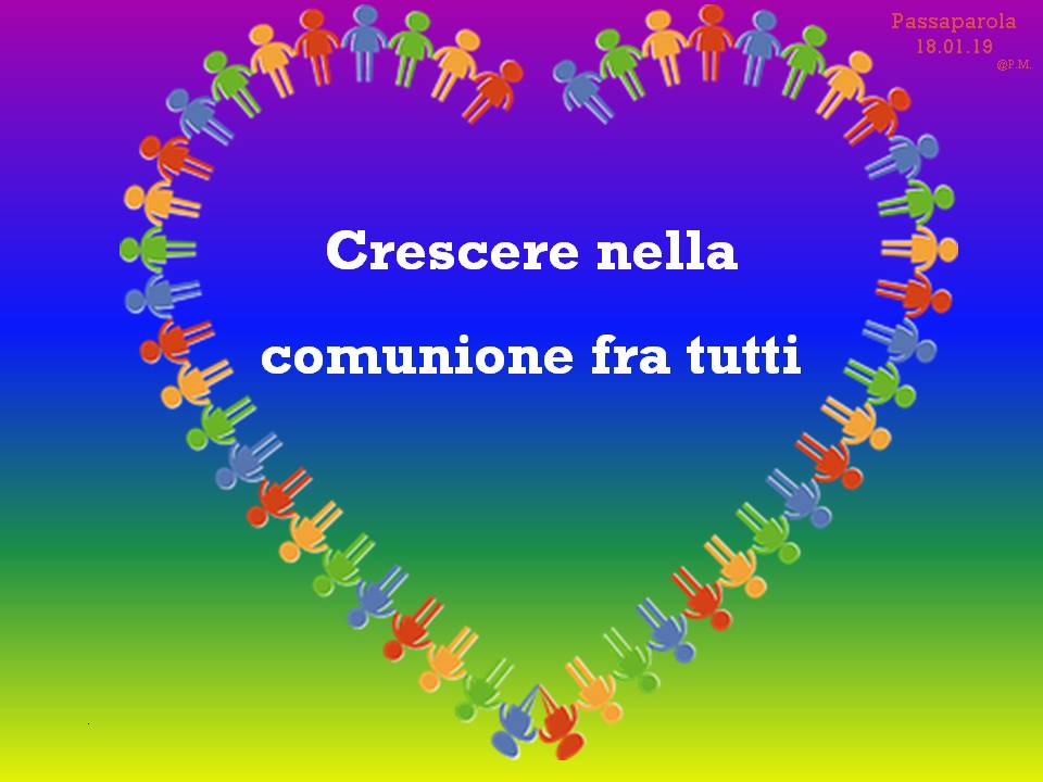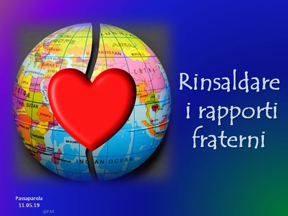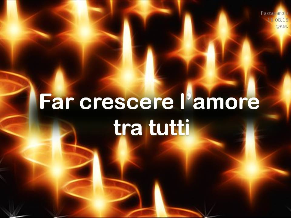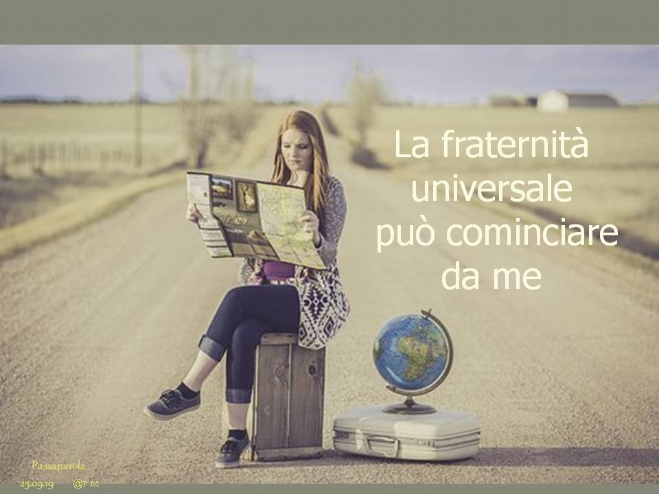 Troverete delle immagini che riportano un passaparola che ci aiuta a vivere ogni giorno la fraternità, diffuso in tutto il mondo, in diverse lingue. Chiara Lubich aveva iniziato “questa pratica” per ricordare e far vivere ai suoi qual è la volontà di Dio: l’amore reciproco. E’ un piccolo escamotage per sentirci ogni giorno – viene inviato soprattutto tramite WhatsApp e si può trovare sul sito internazionale dei focolari – per ricordarci quel che conta: puntare alla fraternità universale.