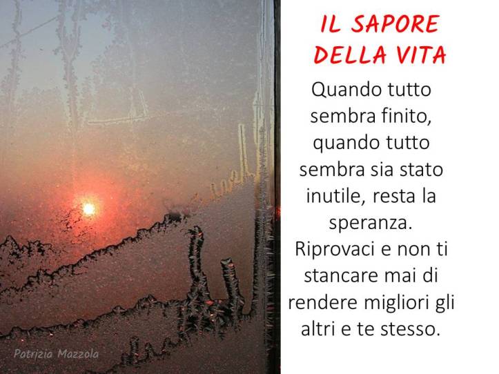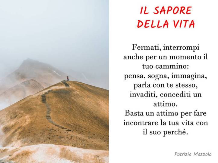 Forse è il sogno che dà il sapore alla vita. “Ma come”, tu diresti, “una cosa che non c’è, che immagini soltanto, come può dare sapore?”. Il sale, elemento quasi invisibile, perso nell’acqua di mare, fa incontrare palato e cibo, fasciandoli in un unico abbraccio. Il mare, sinonimo di infinito, culla di svariate civiltà, nutrimento di interi popoli, luogo di incontri e respingimenti, nasconde e custodisce questo misterioso elemento che dà sapore al tuo corpo. Il sogno come può raccontarsi in una manciata di sale? Il sogno, che di notte disturba e ammalia l’essere vivente, di giorno scompare, per riapparire in brevi momenti durante i quali apparentemente la mente si assenta. Tutto e tutti non facilitano questo suo assentarsi: devi tenere alto il volume a tutti i costi, pena il pensiero. Se arriva disturba, se non arriva ti manca. Fermarsi, frenare, interrompere anche per un momento il tuo cammino: pensa, sogna, immagina, parla dentro di te, con te stesso, invaditi, concediti un attimo. Basta un attimo per fare incontrare la tua vita con il suo perché.