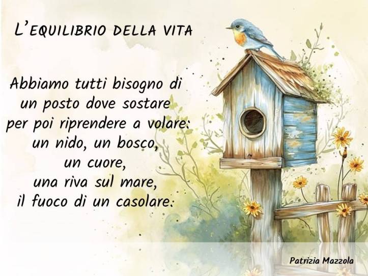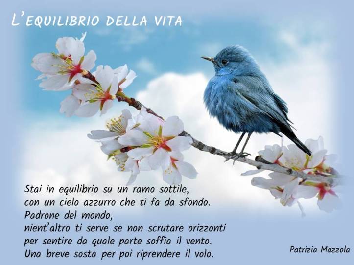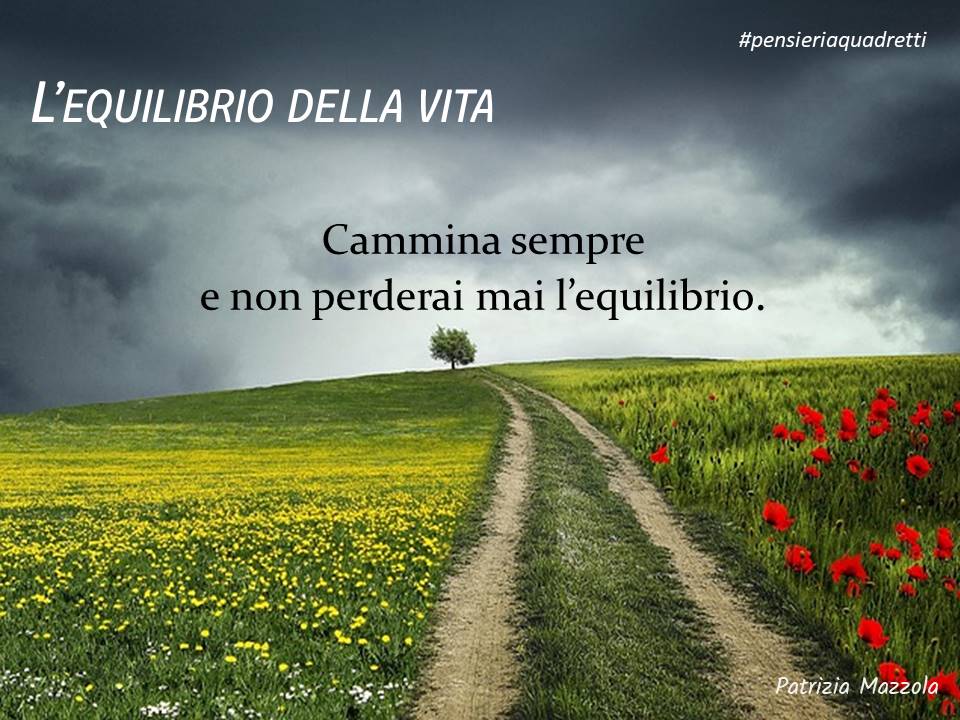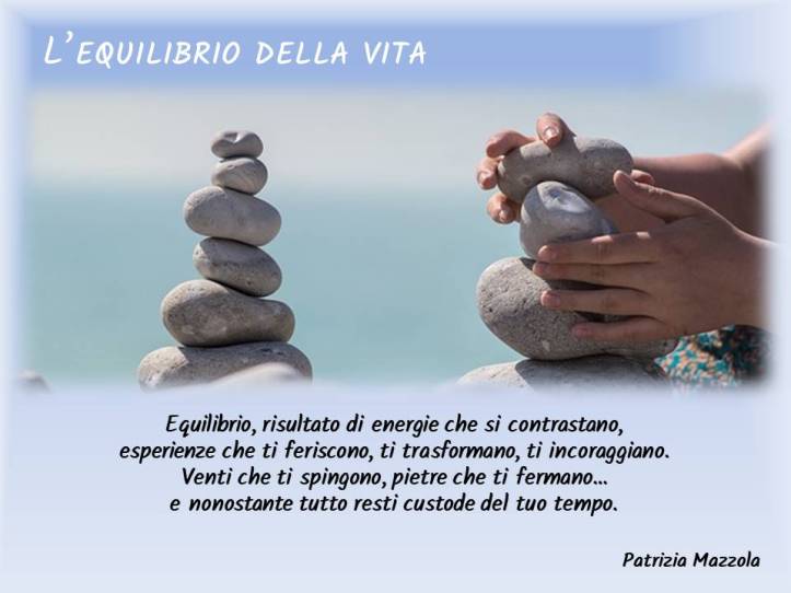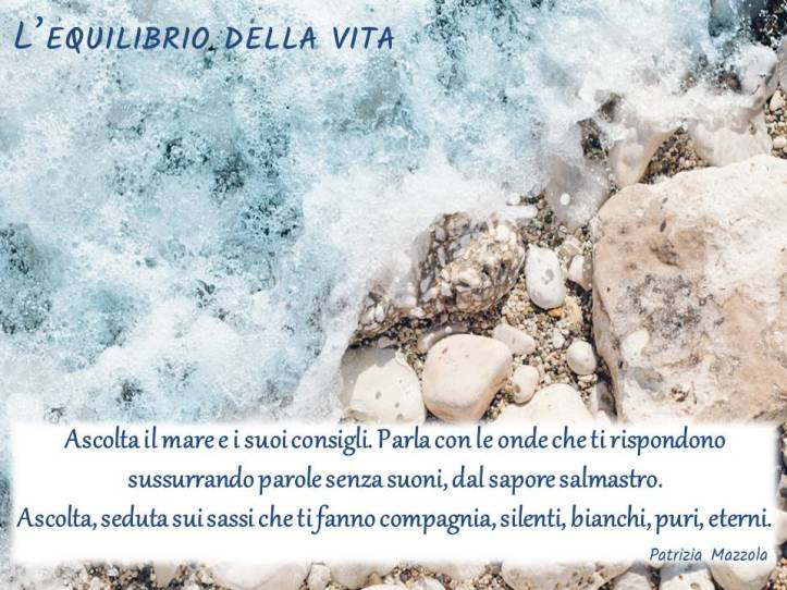 Cammina, procedi, ogni tanto fermati, ma riprendi il percorso. Prendi fiato, guardati intorno, rifocillati, ringrazia, sorridi, medita. Stenditi su di un prato e fatti baciare dal sole. Pensa, rifletti, ricorda, sii grata di ciò che sei, di ciò che hai. Immagina, fallo sempre. Sogna e cammina. Datti un obiettivo e avanza sempre anche se il vento ti spinge contro. Ascolta il mare e i suoi consigli. Parla con le onde che ti rispondono sussurrando parole senza senso, dal sapore salmastro e a volte amaro. Ascolta seduta sui sassi che ti fanno compagnia, silenti, bianchi, incastrati tra loro come in un puzzle. Equilibrio non è star fermi ma girare proprio come fanno i pianeti. Le velocità vorticose, pazzesche ti fanno paura ma sono quelle che ti mantengono in piedi. Legge di natura.